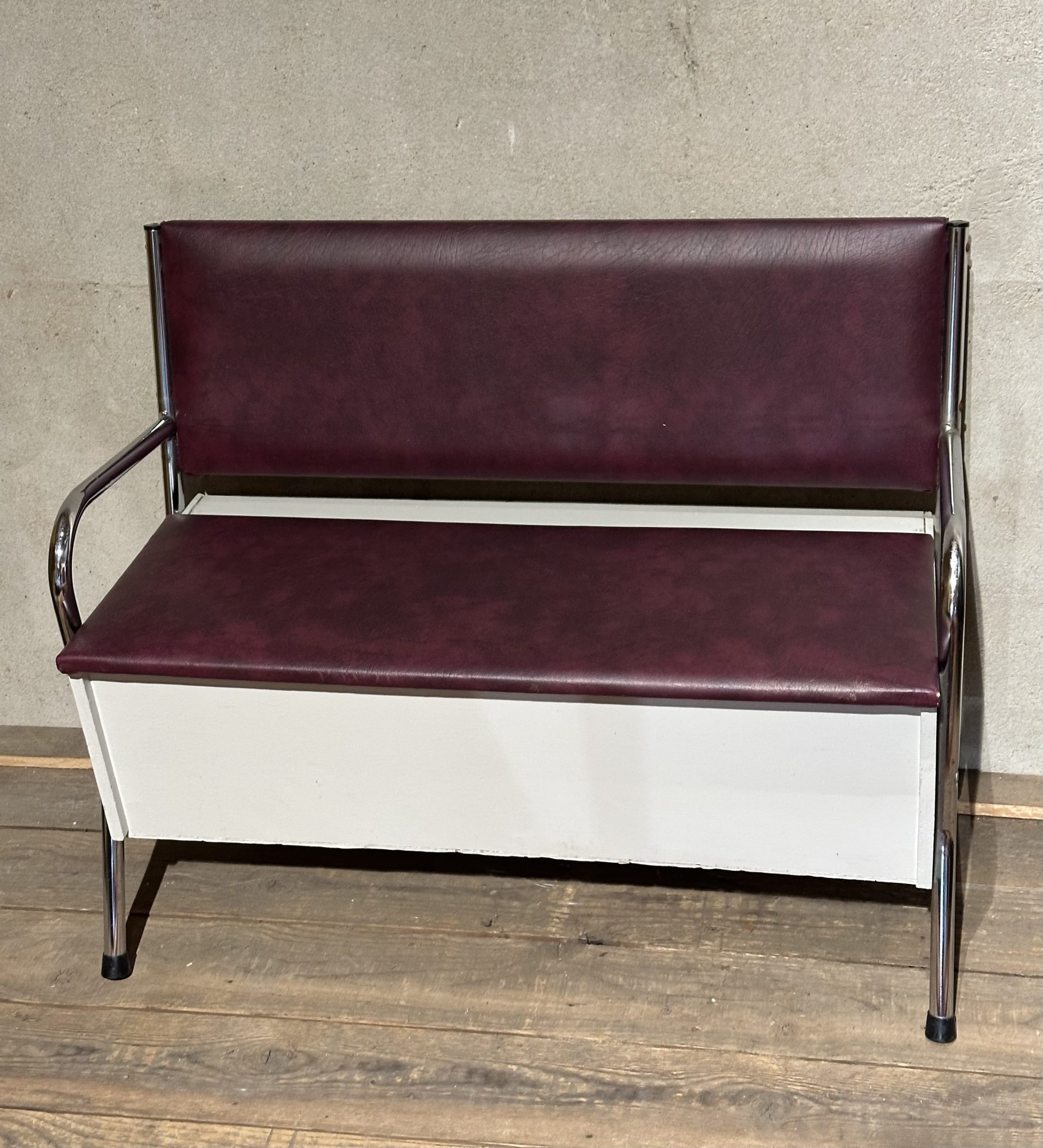 Wit bankje met metalen pootjes, en aubergine kleur skai.