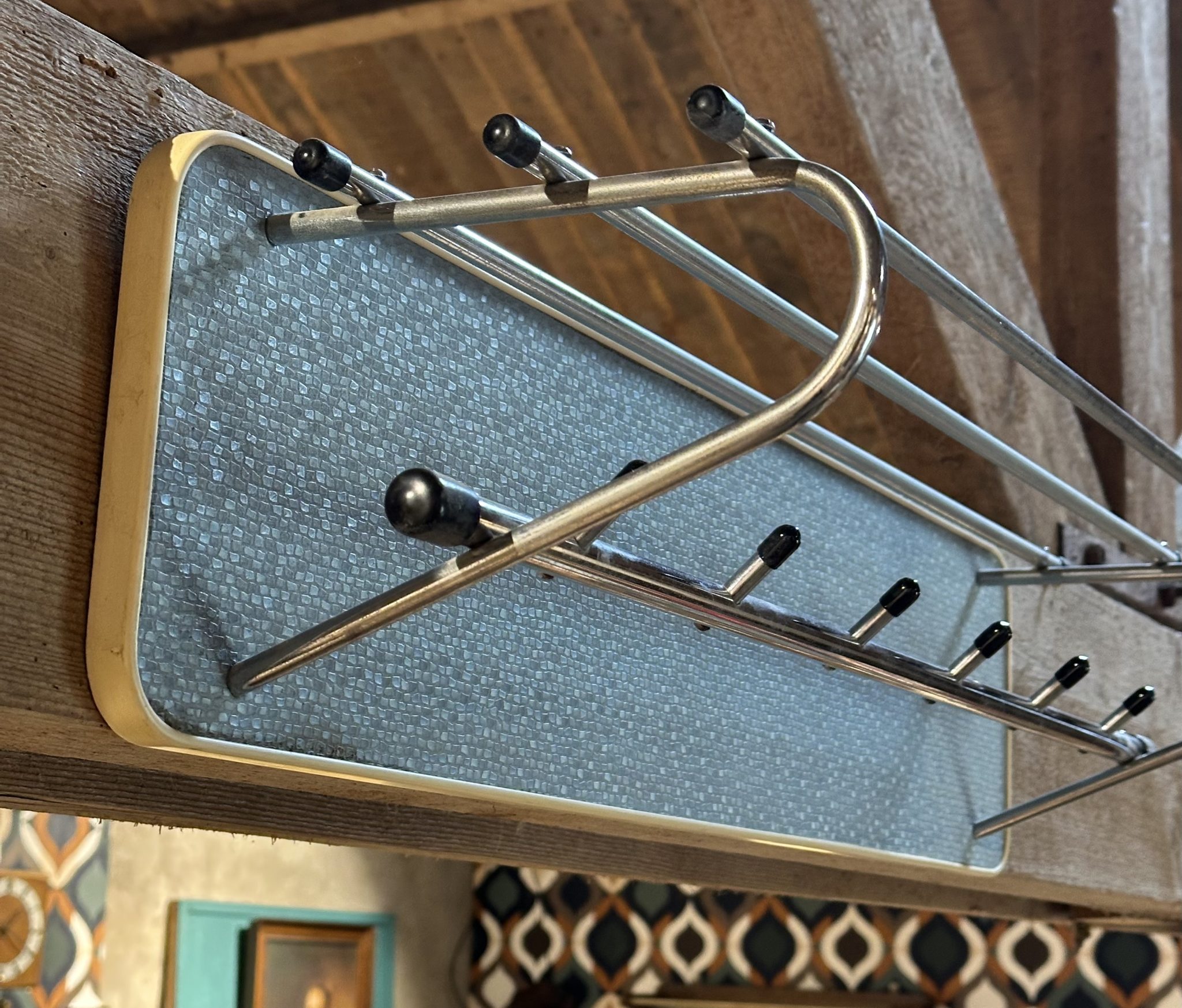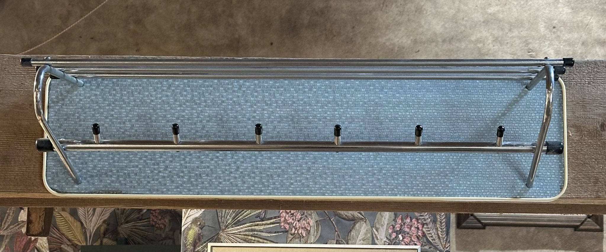 Retro kapstok met lichtblauwe achterkant. 20cm h, 80,5cm b en 24,5cm d.