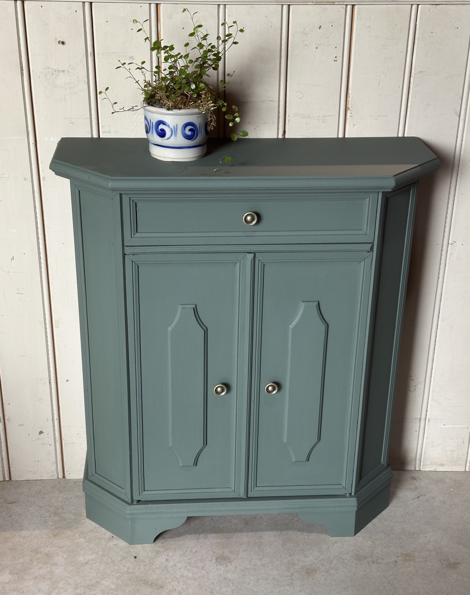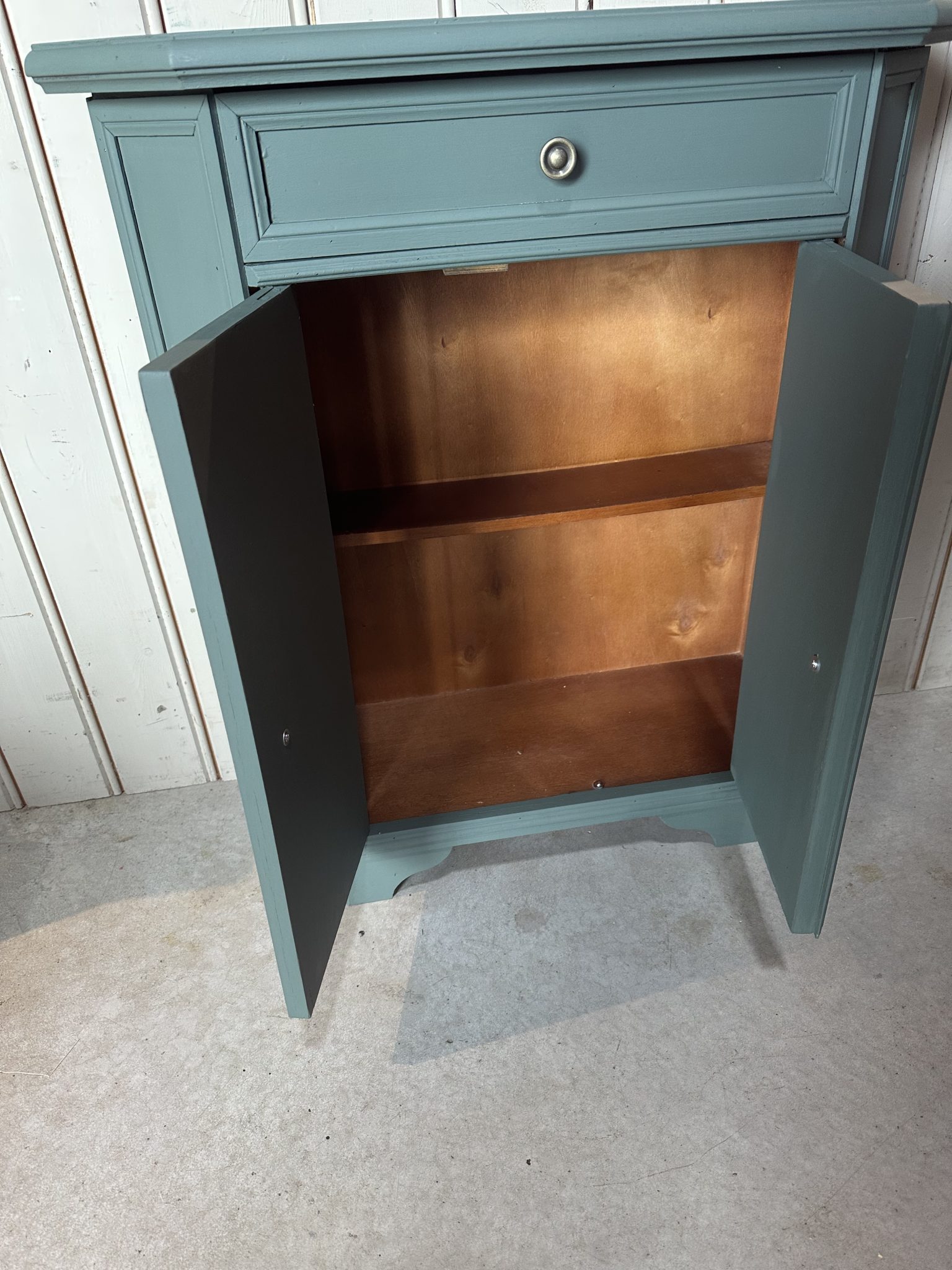 Groen kastje. 76,5cm h, 69cm b en 25,5cm d.