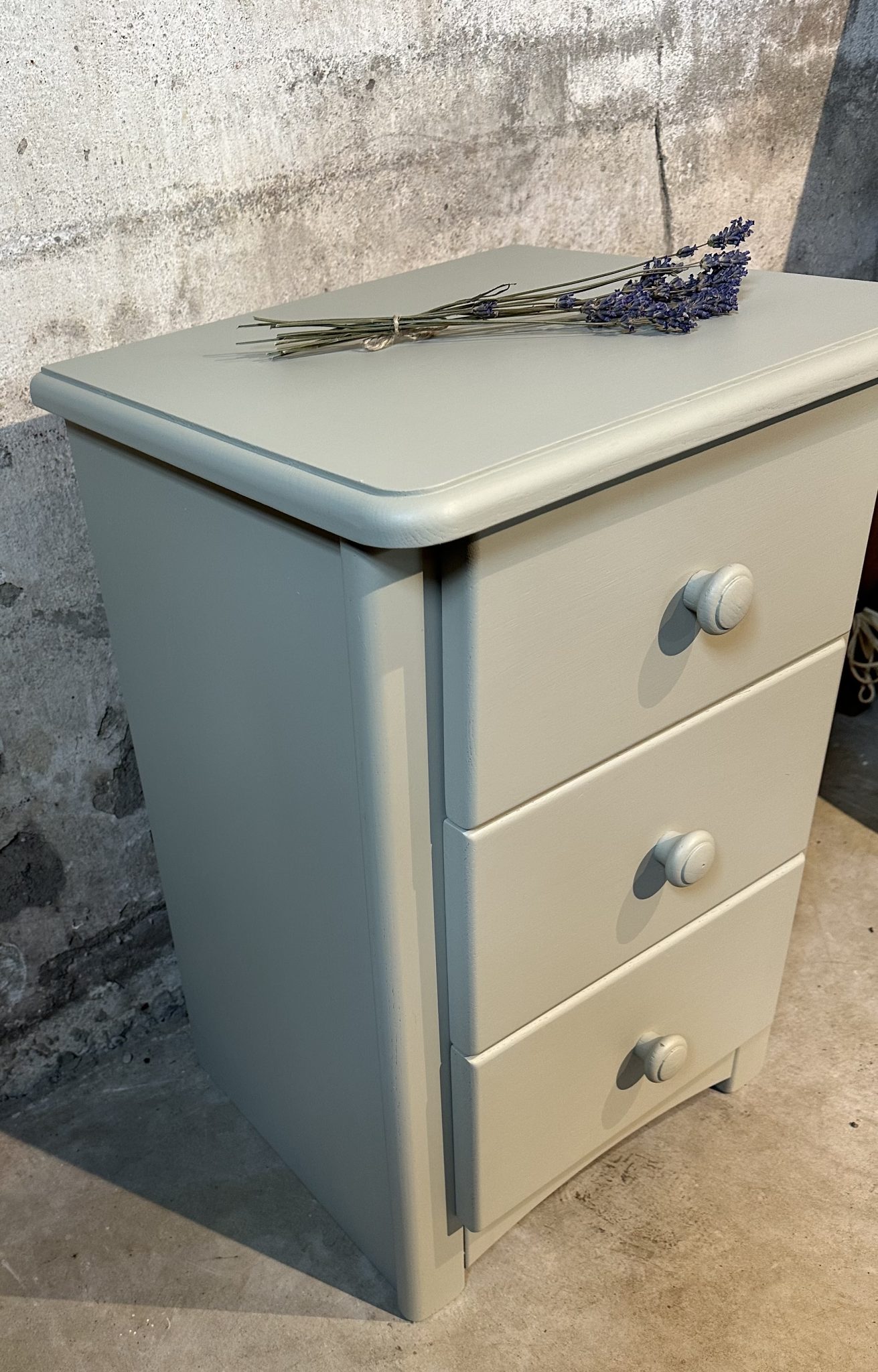 Zacht groen/ grijs ladekastje. 60,5cm h, 40cm b en 35cm d.