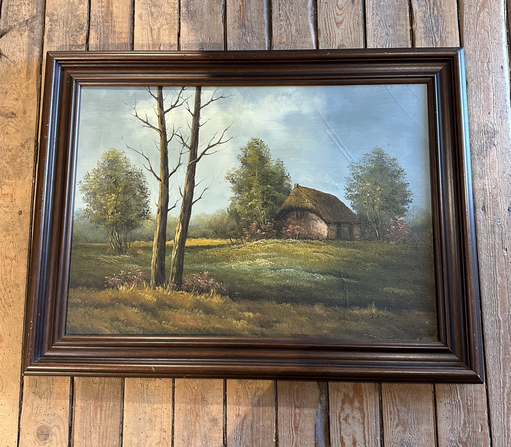 Oud schilderij met boerderij erop geschilderd. 63,5cm h en 83,5cm b.