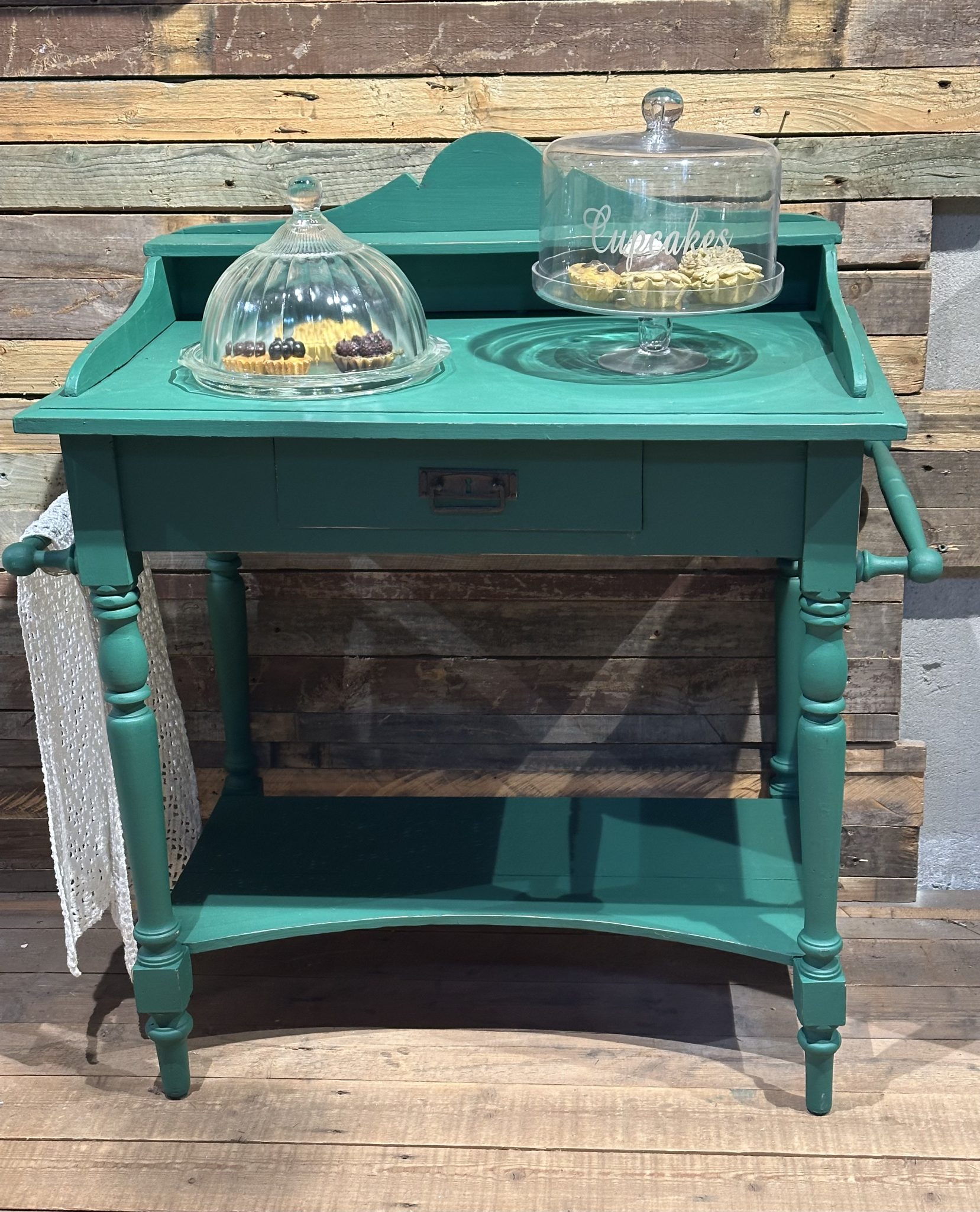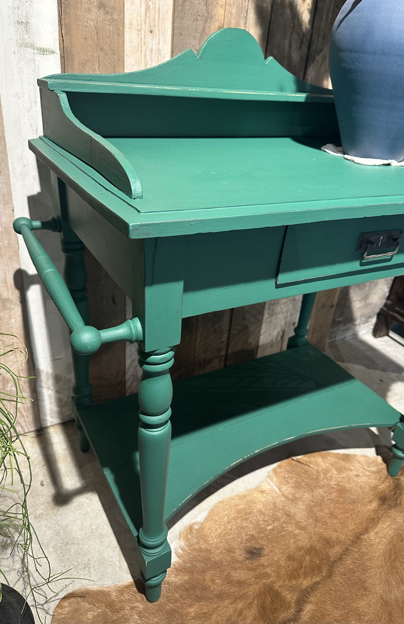 Vintage groen wastafeltje. 98cm h, 82cm b en 50cm d.