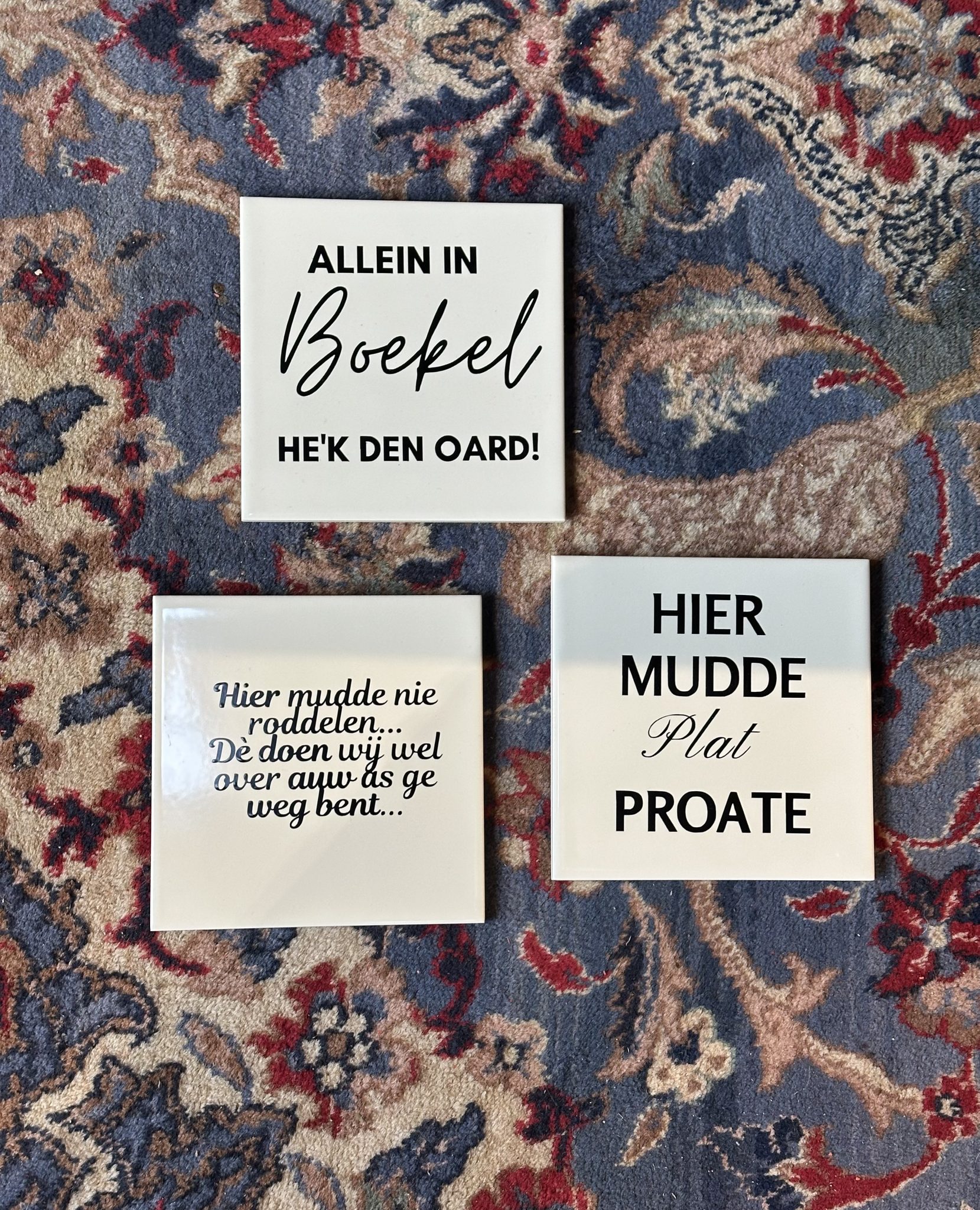 Tegel met tekst, om op te hangen of leuk neer te zetten. 15cm h en 15cm b. 7,50 per stuk.